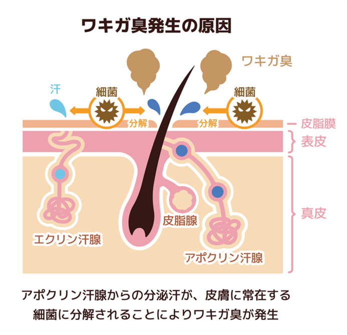 しかし、実はこのアポクリン汗腺からでる汗自体には臭いはないんです!わきが独特の臭いは、アポクリン汗腺から出る汗を、わきがの原因の2つ目である「皮膚に存在する常在菌」が食べて分解すると発生するんです。